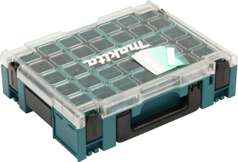 Přenášení je usnadněno rukojetí na přední straně a dvěma zapuštěnými rukojeťmi po stranách. Na přední a boční straně lze použít popisné štítky. Průhledné víko také umožňuje sledovat malé části uvnitř. Včetně boxových vložek (počet x velikost) 6x1, 3x2, 2x3, 1x4, 1x5 a sady štítků. Organizér odpovídá velikosti MAKPAC 1.