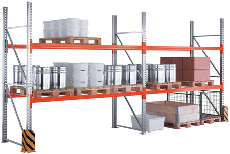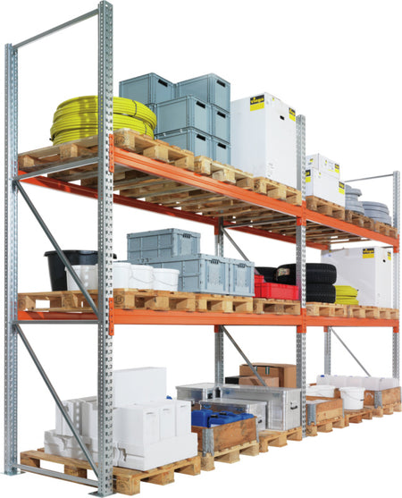 Pozinkovaný regál v hořcově modré barvě RAL 5010 na vyžádání, vzpěry v červeno-oranžové barvě RAL 2001