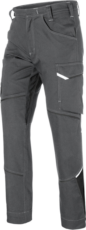 2 postranní kapsy s velkým otvorem, pravá multifunkční kapsa s volnou kapsou pro metr, kapsa na smartphone, další kapsy na pero, zadní kapsa s klopou a skrytým zapínáním na patentky, levá volná stehenní kapsa s klopou a skrytým zapínáním na patentky a kapsa na smartphone ve stehenní kapse