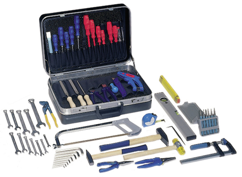1x dřevěný skládací metr 2 m / 1x hliníková vodováha 400 mm / 1x svinovací metr 3 m / 12x kombinovaný klíč AF 6/7/8/9/10/11/12/13/14/15/16/17 mm / 3x plochý šroubovák 4,0x100/5,5x100/8x175 mm / 2x křížový šroubovák PH 1/PH 2 / 4x plochý šroubovák VDE 2,5x75/3x100/4x100/5,5x125/6,5x150 mm / 2x křížový šroubovák VDE PH 1/PH 2 / 1x zkoušečka napětí 3x65 mm / 1x automatické odizolovací kleště / 1x bezpečnostní nůž / 1x pinzeta 110 mm / 1x univerzální nůžky / 1x štípací kleště 165 mm / 1x úzké kleště 160 mm / 1x kleště na vodní čerpadla 240 mm / 2x kladivo s křížovým čelem 200/500 g / 1x kombinované kleště 180 mm / 1x plastové kladivo 32 mm / 1x výstružník 100 mm / 1x rýsovací jehla / 1x plochý sekáč 175 mm / 1x sada, 6 ks (5x průbojník 2–6 mm, 1x důlčík) / 3x pilník s rukojetí 150 mm H2: plochý/kulatý/půlkulatý / 8x 6hranný šroubovák 2–10 mm / 1x pila na kov s listem 300 mm / 1x šroubovací svorka 200 mm