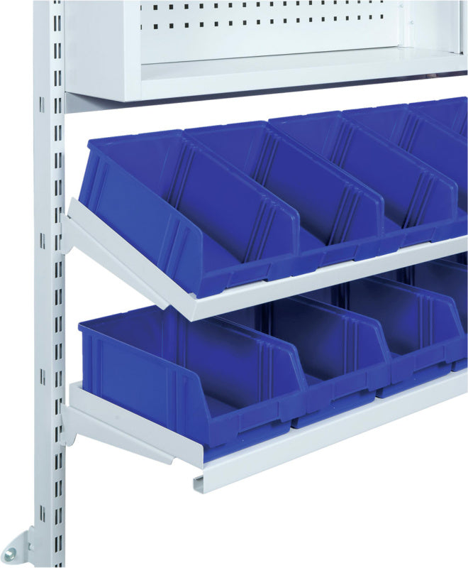 Pro zavěšení na dvě opěrné výztuhy (nebo na nástěnný či sloupkový stojan); lze použít jako odkládací plochu na pracovišti a pro uložení průhledných skladovacích krabic.