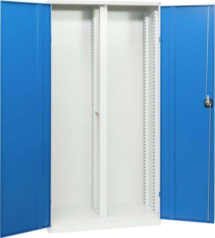 Prázdná skříň s dvoukřídlými dveřmi s plnými plechovými dveřmi, výška 1950 mm, a pevná vestavěná přepážka
