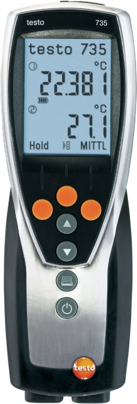 Přístroj na měření teploty testo 735 je vysoce přesné zařízení na měření teploty vhodné pro univerzální použití. Ideální pro použití v náročných prostředích. Lze připojit ke snímačům TE typu K/T/J/S/PT100. Pomocí ponorného/penetrační snímače PT100 je dosaženo systémové přesnosti až 0,05 °C s rozlišením až 0,001 °C.