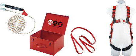 Bezpečnostní sada obsahující poutací postroj MAS 30, bezpečnostní úvaz MAS SK 12 (délka 15 m), lano B2 (délka 2 m) a plechový kufřík
