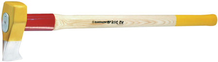 Nejbezpečnější možné napojení; ochranná manžeta na násadě, prstencový klínek, pojistná destička a vrut spojuje hlavu a násadu sekery do jediného celku