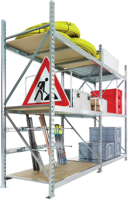 Regály s velkým odstupem rámů nabízejí velký úložný prostor pro objemné díly a obzvláště velké nebo těžké předměty.