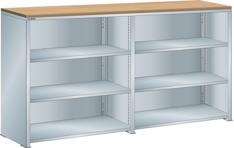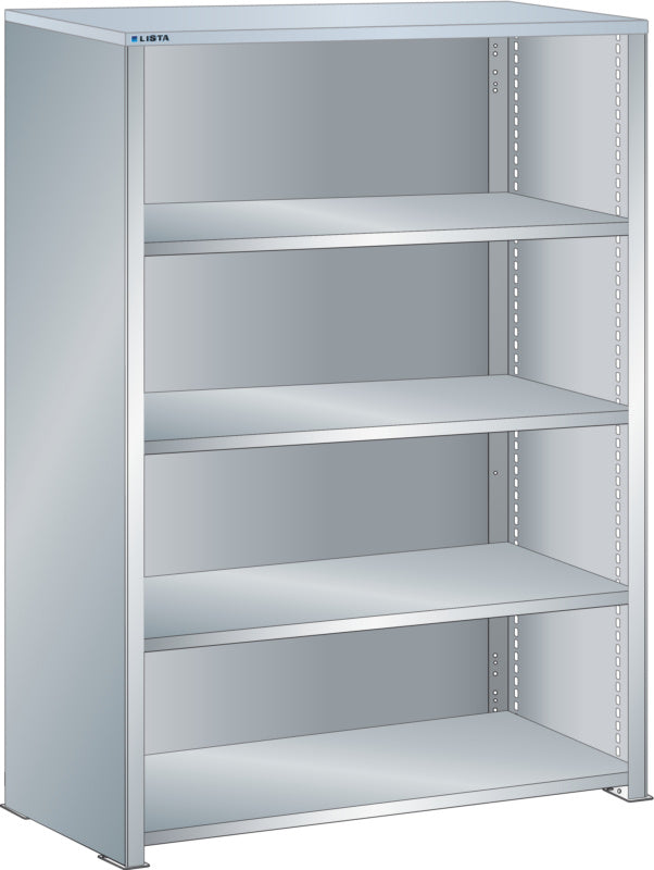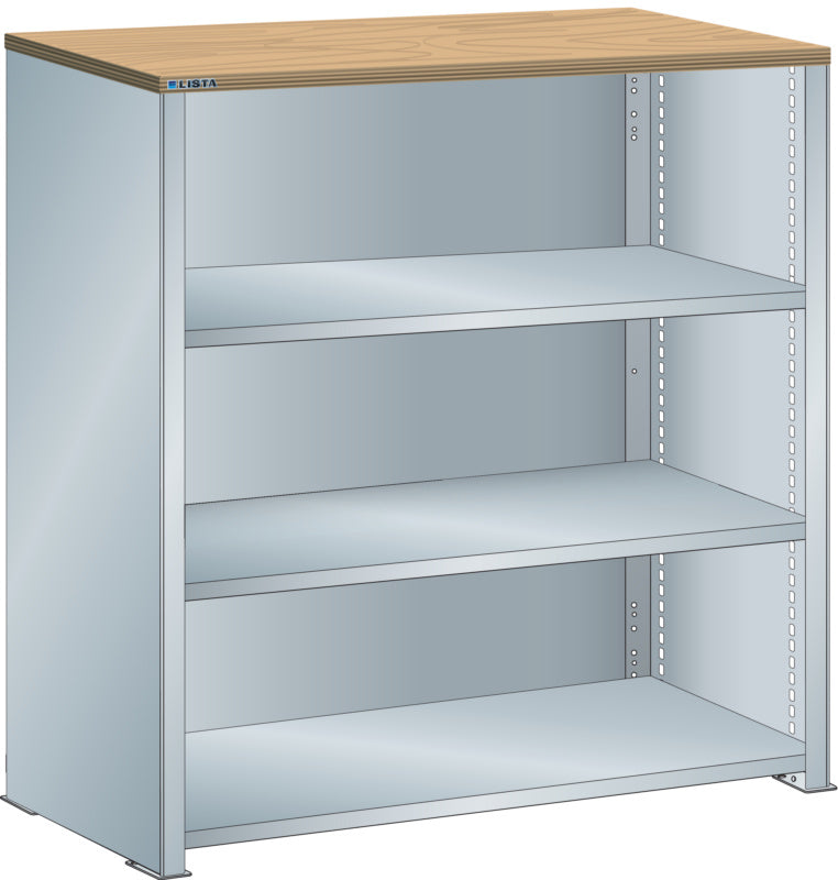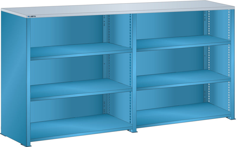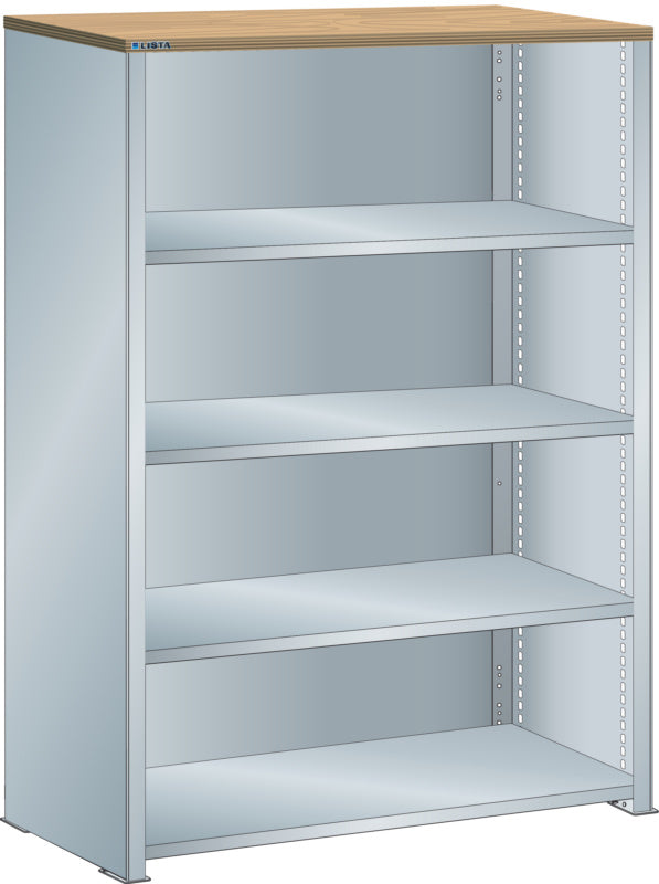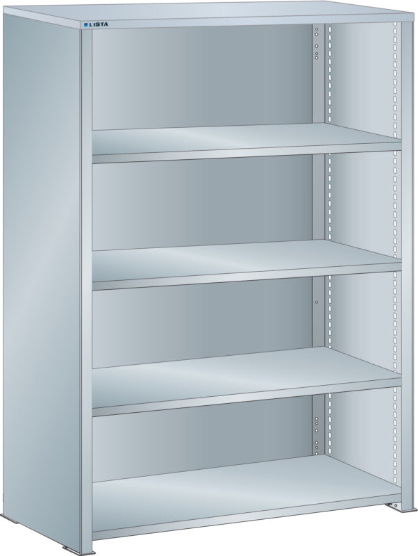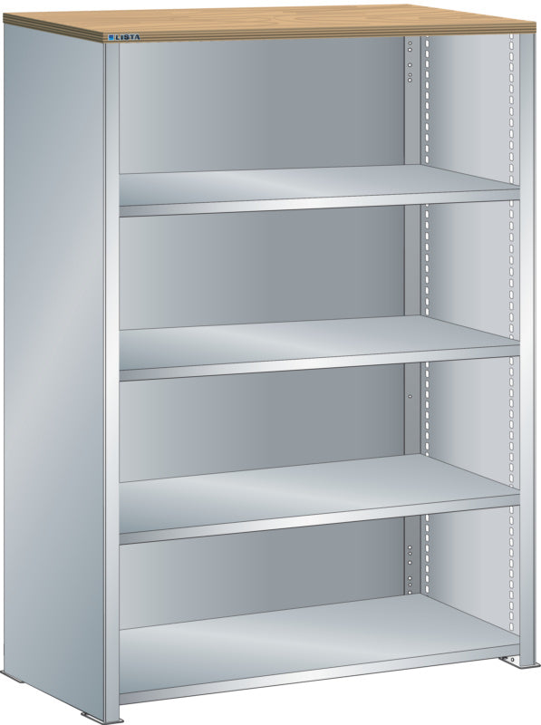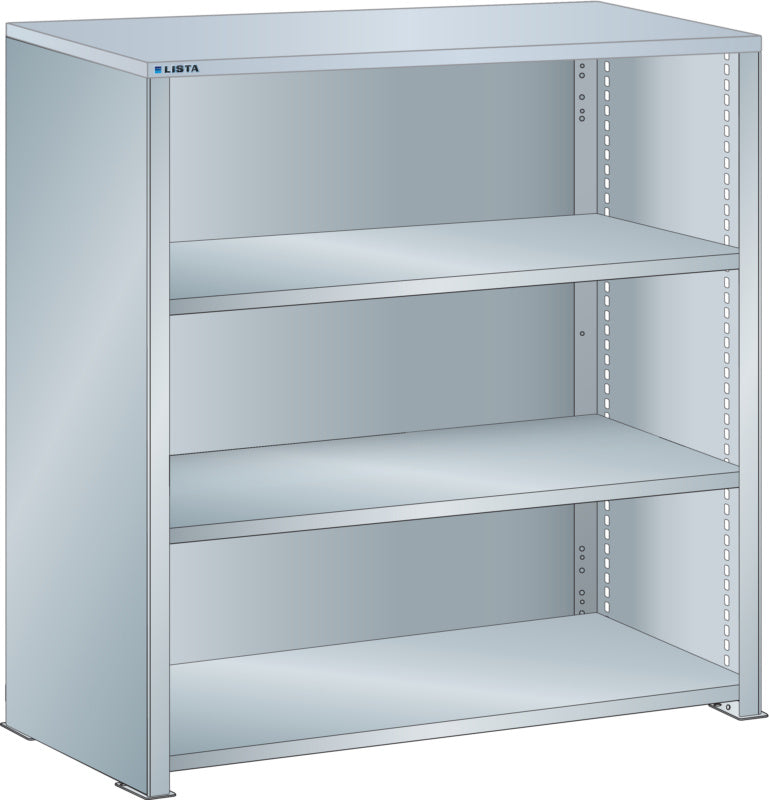 Bočnice: Výbava: Volitelně s krycím deskou z překližky nebo syntetické pryskyřice. Krycí desky se upevňují pomocí závěsných montážních konzol. Včetně otvorů a upevňovacího materiálu. Boční stěny, uzavírací boční stěny (pravé a levé) pro zakrytí řad štěrbin a pro lícující spojení s předním trojúhelníkovými skládanými okraji, zadní deska pro zakrytí policových polí vzadu a podélnou stabilizaci. Verze: Ocelový plech. Barva: dle barevného schématu nebo pozinkovaný povrch.