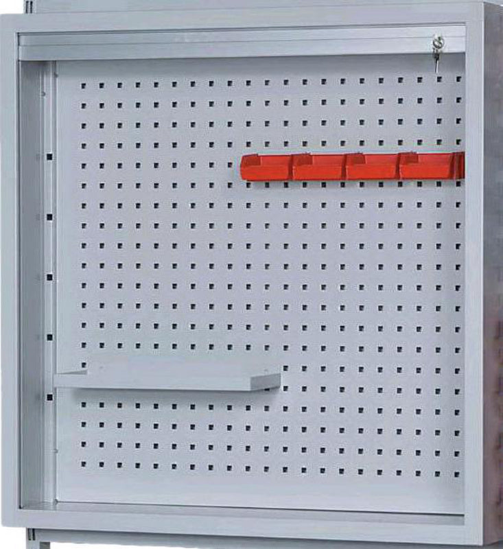 Bezpečné a bezprašné skladování dílů za uzamykatelnými roletami pro montáž mezi hlavní a prostřední vzpěry, rovněž vhodné k montáži na vzpěrou nosníku a vloženou opěrou, rovněž vhodné k montáži na stěny a na pracovní stoly.