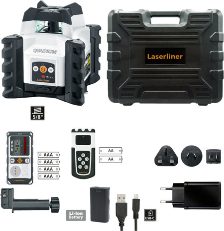 s nabíjecí baterií, napájecím zdrojem/nabíječkou, univerzálním držákem, dálkovým ovládáním, laserovým přijímačem, pouzdrem