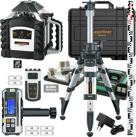 s nabíjecí baterií, napájecím zdrojem/nabíječkou, univerzálním držákem, stativem 175 cm s ramenním popruhem, dálkovým ovládáním, teleskopickou nivelační latí 5 m, laserovým přijímačem, pouzdrem
