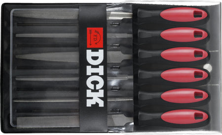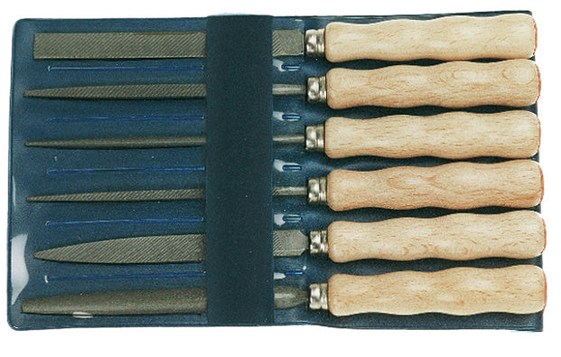 6dílná sada v plastovém vaku, která obsahuje nástroje následujících tvarů s rukojetí: plochý s tupým koncem, se špičatým koncem, půlkulatý, trojhranný, čtyřhranný a kulatý