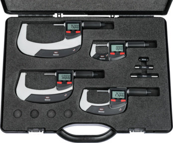 Návod k použití, baterie, nastavovací kalibr (od rozsahu měření 25–50 mm), cestovní pouzdro