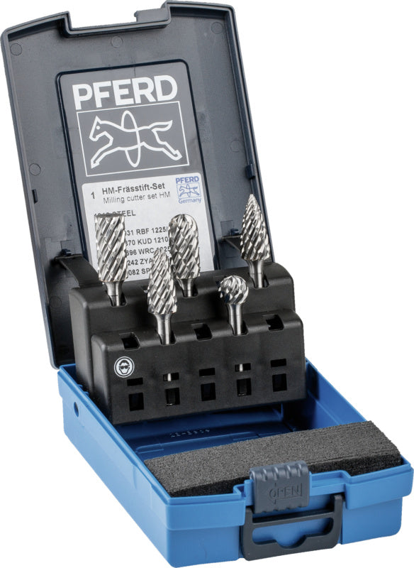 Pěr fréz ze slinutého karbidu v nerozbitné pastové krabičce. K dispozici je dalších pět prostorů, které uživatel může využít podle potřeby.