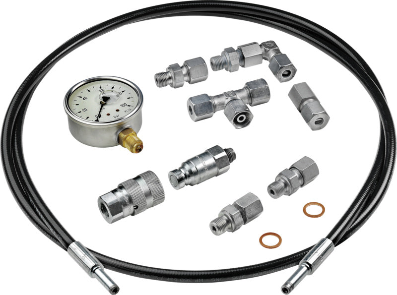Tato souprava pro připojení zahrnuje následující: 1x hydraulická připojovací hadice, délka 2 m; 2x přímá trubková tvarovka, 2x přímá spojka pro zašroubování; 1x T-tvarovka, 1x tlakoměr 0100 bar; 1x přímá tvarovka s objímkovým koncem, 2x rychlospojovací pouzdro; 2x rychlospojovací vsuvka, 2x Cu těsnicí kroužek pro G1/4