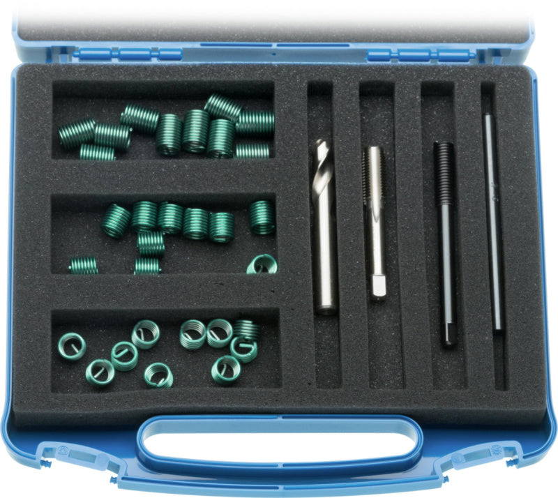 Opravná sada pro závity velikostí vložky: 20 x M4/M5/M6 nebo 10 x M8/M10/M12, vždy 1 x D/1,5 x D/2,0 x D a spirálový vrták HSS, závitník HSS, šroubovací nástroj a lamač čepů, vyrobené z vysokopevnostní oceli