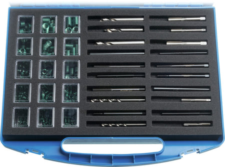 230dílná sada obsahující 20x M5/M6, 10x M8/M10/M12, vždy 1xD/1,5xD/2,0xD a 5 x spirálový vrták HSS, závitník HSS, otáčecí nástroj a drtič čepů vyrobené z vysokopevnostní oceli. Závitové vložky vyrobené z rombicky profilovaného drátu z nerezové oceli tvarovaného do šroubovice