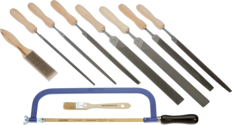 1x plochý pilník 300 mm, tvar 1 / 1x plochý pilník 300 mm, tvar 3 / 1x trojhranný pilník 250 mm, tvar 1 / 1x trojhranný pilník 250 mm, tvar 3 / 1x kulatý pilník 250 mm, tvar 2 / 1x čtyřhranný pilník 250 mm, tvar 2 / 1x půlkulatý pilník 250 mm, tvar 2 / 1x kartáč na čištění pilníků / 1x oblouk pily 300 mm / 1x bimetalový pilový list / 1x kartáč na třísky