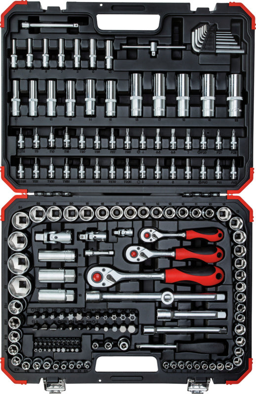 V robustním plastovém kufru s kovovými sponami a samolepicími prohlubněmi pro nářadí