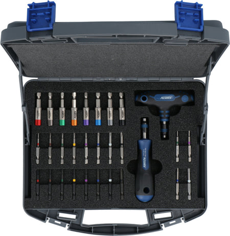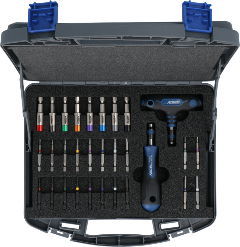 S rukojetí pro přidržení bitů a příčnou rukojetí, v pouzdru s pěnovou vložkou