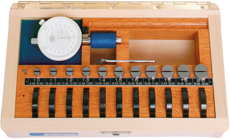 Držák s měřicími hlavicemi a měřícími jehlami v dřevěném pouzdru, číselníkový úchylkoměr a nastavovací kroužky nejsou součástí balení.