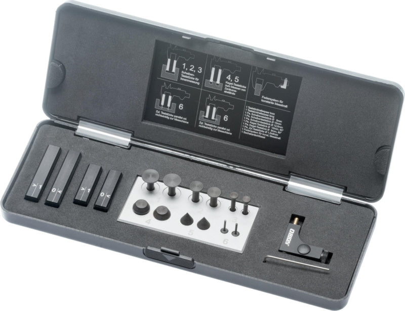 2 nosiče měřicích dotyků, 6 párů měřicích dotyků, klíč na šestihrannou matici, v pouzdru