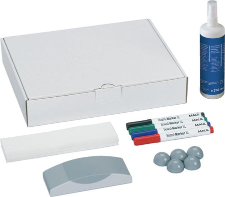 4 fixy na tabuli, 1 stěrka na tabuli, 10 ks fleecu na stěrku, 1 lahvička čističe na bílou tabuli 250 ml, 5 šedých kulatých magnetů, průměr 30 mm