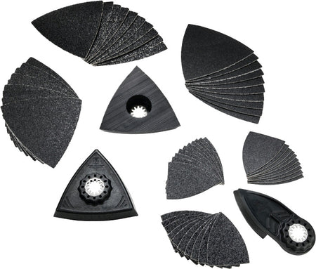 2x brusná deska, neděrovaná (80 mm), 1x brusný prst, 10 ks brusných papírů, neděrované (zrnitost 60, 80, 120) pro brusné desky a brusné prsty