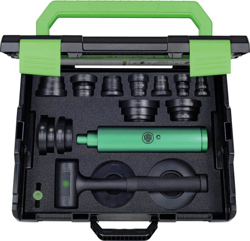 33 kroužků, 3 trubek, 1 kladívko bez zpětného rázu, 1 tabulka velikostí kuličkových ložisek