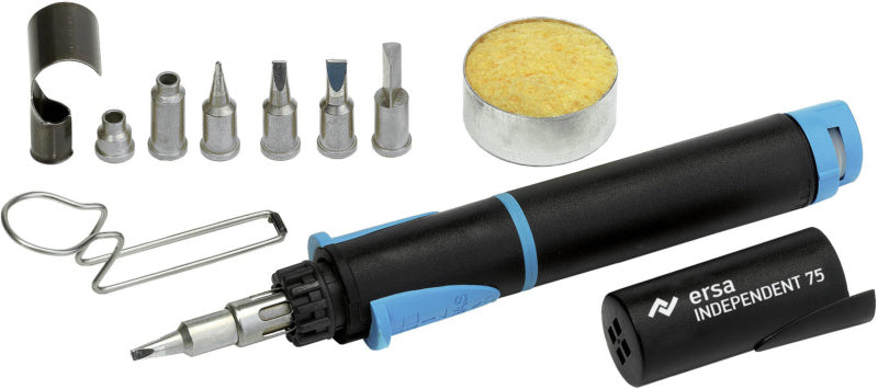 Obsah kufříku: pájecí hrot 1,0/2,4/3,2 a 4,8 mm (1 od každé velikosti), tvar dláta; horkoplynná tryska, horký nůž, reflektor (pro smrštitelné bužírky), čisticí houbička, nádobka na houbičku a 1 plynový zásobník