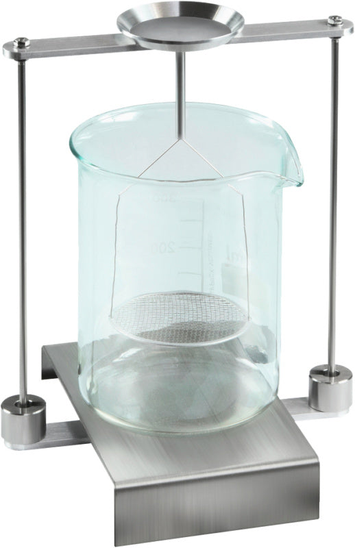 Rozsah dodávky: Kádinka (průměr 84 mm × výška 113 mm), teploměr, držák vzorku, adaptér, vyvažovací závaží, olovnice (nerezová ocel, 20 g), univerzální drátěný košík pro plovoucí a potápějící se pevné látky. Drát použitý v drátěném košíku má průměr 0,5 mm a splňuje požadavky normy DIN EN ISO 1183-1 (Metody stanovení hustoty nelehčených plastů)