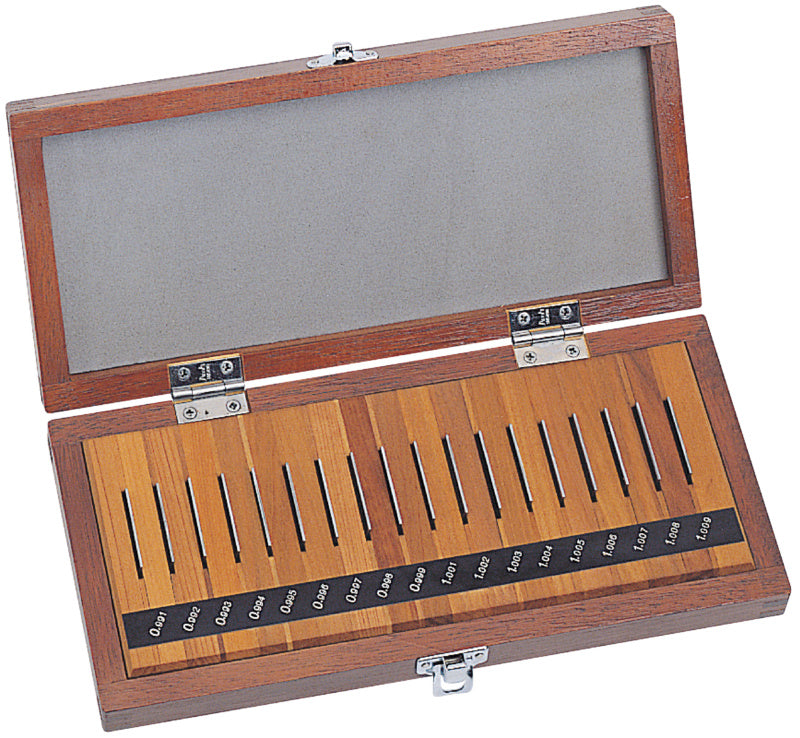 SKU: 32021001, Třída tolerance: 0, Počet kusů v sadě: 46 ks, Materiál: Ocel, Jmenovitá velikost vsadě: 1,001-1,009 mm, po 0,001 mm;1,01-1,09 mm, po 0,01mm;1,1-1,9 mm, po 0,1 mm;1-9 mm, po 1 mm;10-100 mm, po 10 mm