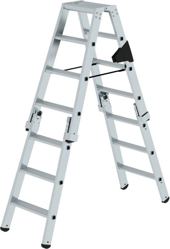 Volně stojící hliníkový příčkový žebřík, robustní obdélníkové trubkové bočnice, drážkované příčky s hloubkou 80 mm, přírubové spojení příček s bočnicemi s koncovými ohyby ve čtyřech směrech, kónické vedení bočnic pro bezpečné postavení, oblast úchopu ergo-pad® s upínacím mechanizmem, čtyřsměrný přišroubovaný pevný hliníkový kloub žebříku, patky žebříku nivello® s patentovanou technologií nastavení sklonu ve dvou osách, možnost vybavení nášlapnými plochami clip-step, clip-step R13 nebo clip-step relax, prostorově úsporná přeprava a uložení