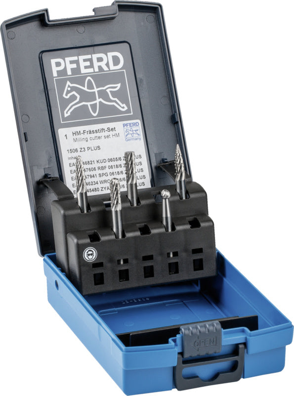 Pěr fréz ze slinutého karbidu v nerozbitné pastové krabičce. K dispozici je dalších pět prostorů, které uživatel může využít podle potřeby.