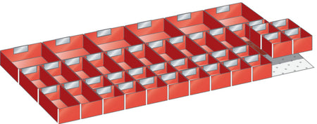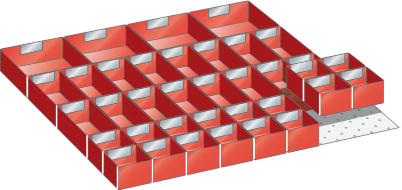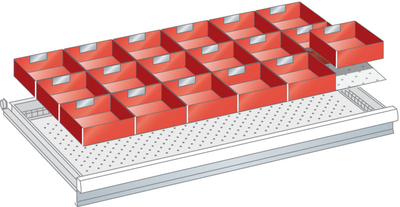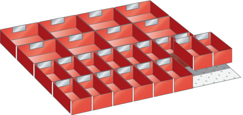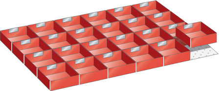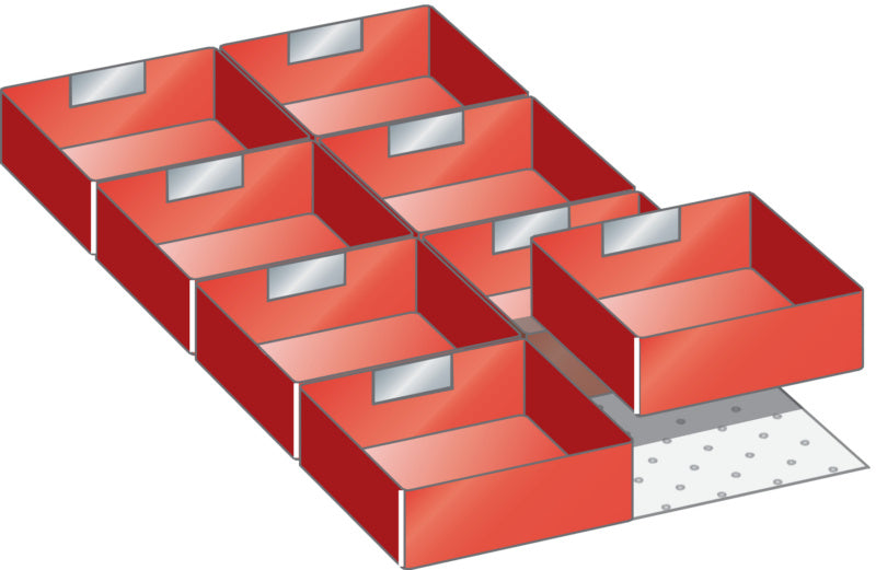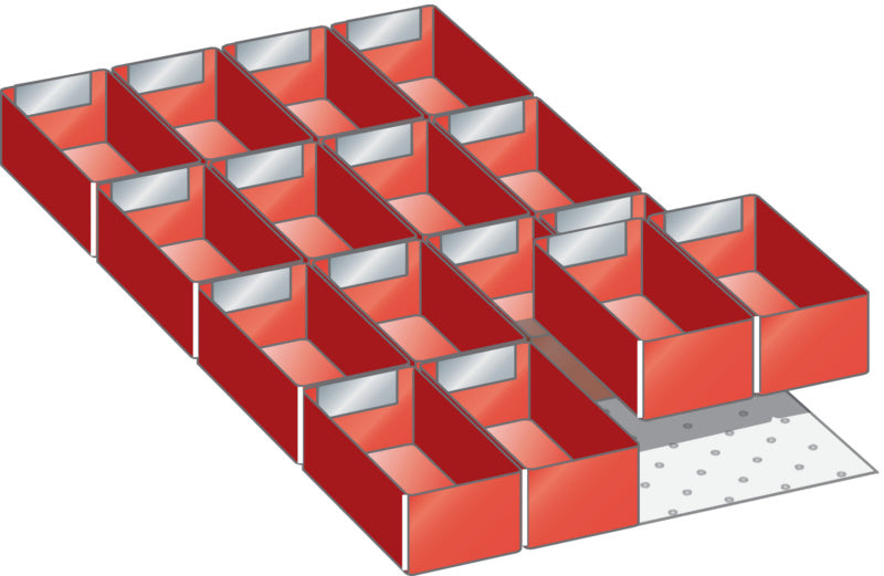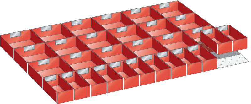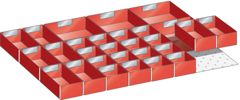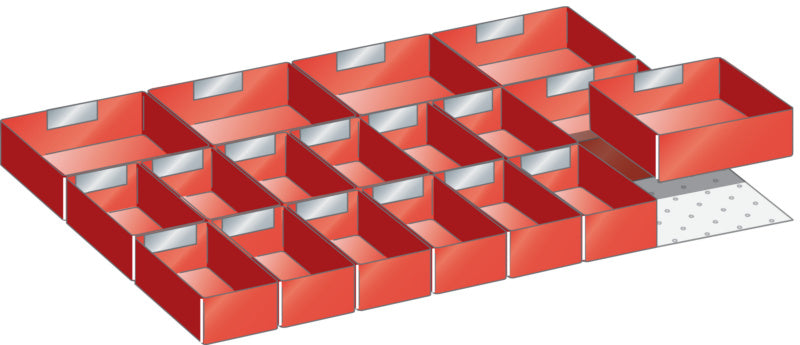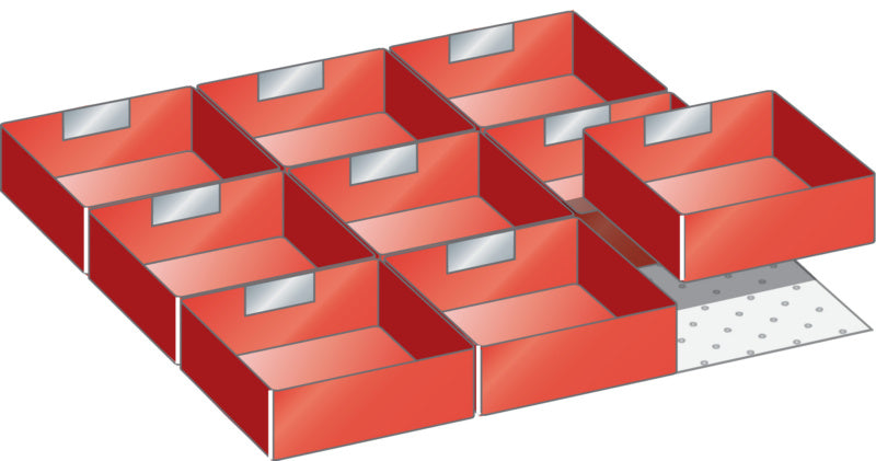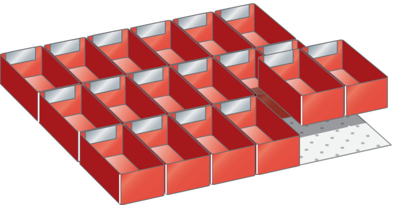 Vkládací boxy: Lze použít v modulárním systému se všemi velikostmi zásuvek. Provedení: Vkládací boxy, madlo s označením a dělicí prvek z polystyrénu. Barva: Červená barva.