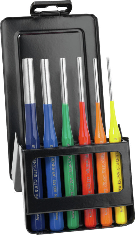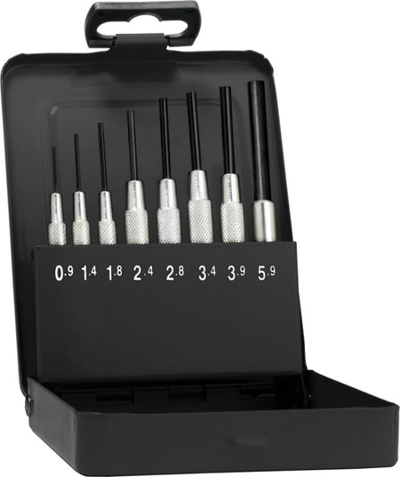 Sada vytloukačů čepů v krabici z ocelového plechu