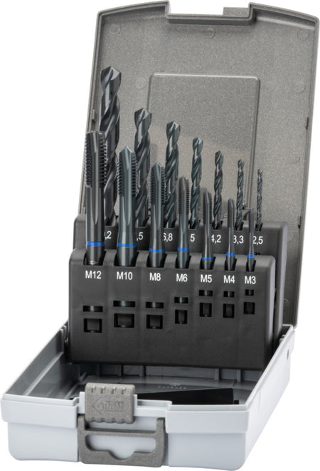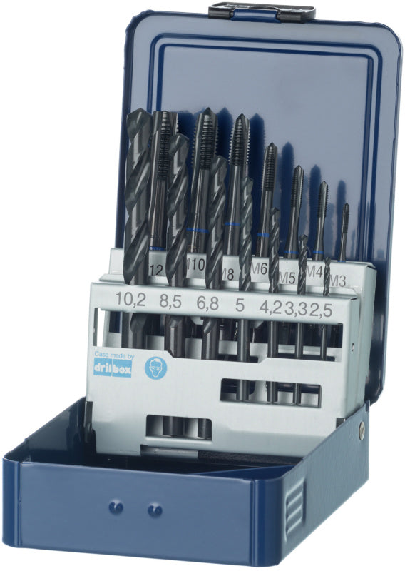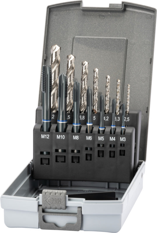 Sada závitníků HSSE + jádrový vrták pro průchozí a slepé otvory, v oceli (nerezové oceli), neželezných kovech a (litině) – 1 000 N/mm².
