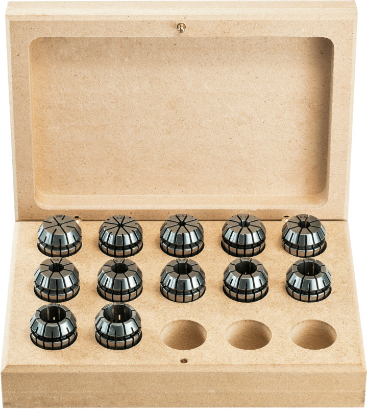 1x HP (vysoká přesnost) 5 µm sada sklíčidla v dřevěném pouzdře. (ER16 = prům. 3–10 mm, 6 ks; ER25 = prům. 4–16 mm, 7 ks; ER32 = prům. 4–20 mm, 8 ks; ER40 = prům. 4–26 mm, 12 ks)