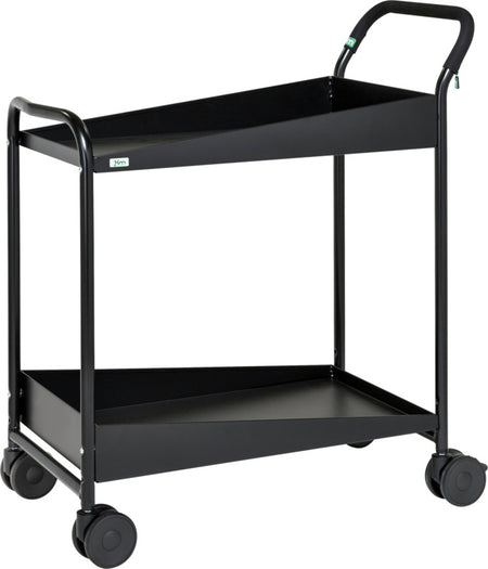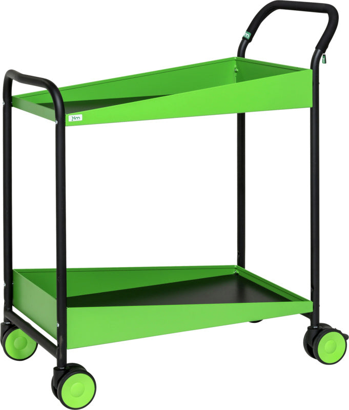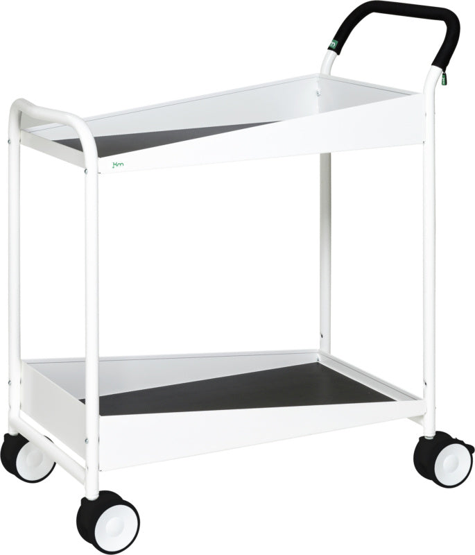 Stolový vozík se dvěma policemi. Díky černým pryžovým rohožím a dvojitým kolečkům s kuličkovými ložisky je vozík elegantní a snadno se s ním manipuluje. Vozík je dodáván s měkkou rukojetí KM600H, která je k dispozici ve třech barvách.