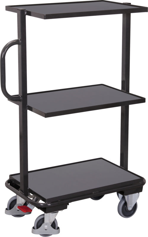 Svařovaná ocelová konstrukce, police z opracovaných dřevěných desek, povrch s bukovou povrchovou úpravou, 10 mm vysoký okraj, vhodné pro plastové boxy 600 x 400 mm (ŠxH), pevné střední a horní police, nosnost horních a středních polic: 50 kg, vozík s práškovým nástřikem v barvě RAL 5010, hořcově modrá, trvalá ochrana povrchu, odolnost proti nárazu a poškrábání, termostatické gumové pneumatiky na plastových ráfcích s přesnými kuličkovými ložisky s hlubokými drážkami, barva šedá, nezanechávají stopy, závit a chránič nohou, dvě otočná kolečka s EasySTOP a dvě pevná kolečka.