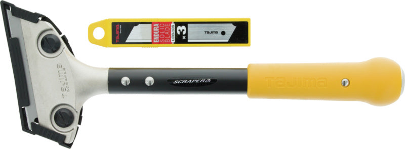 Škrabka s vyměnitelnými čepelemi na rukojeti. Hlava škrabky je vyrobena z litého hliníku a rukojeť byla dodatečně vyztužena.