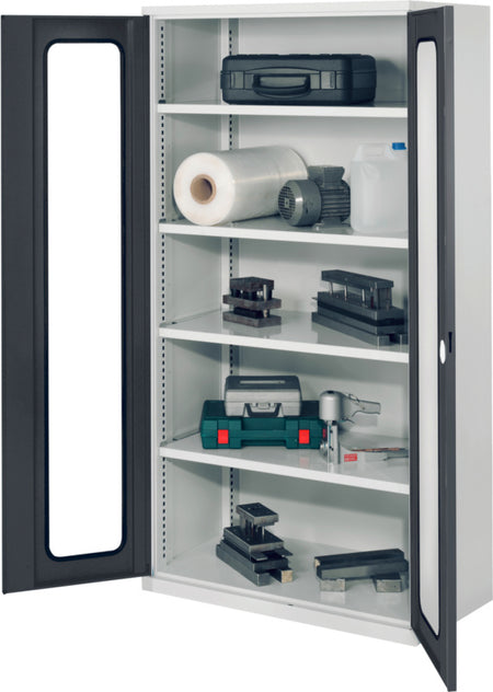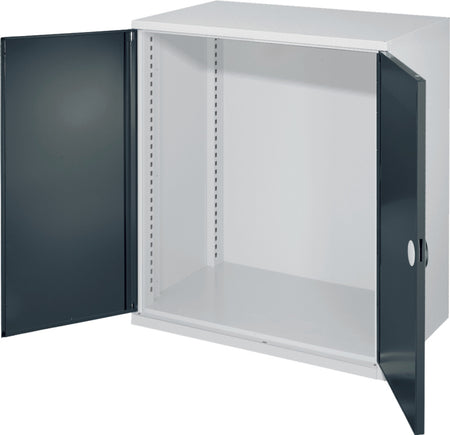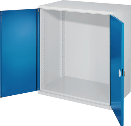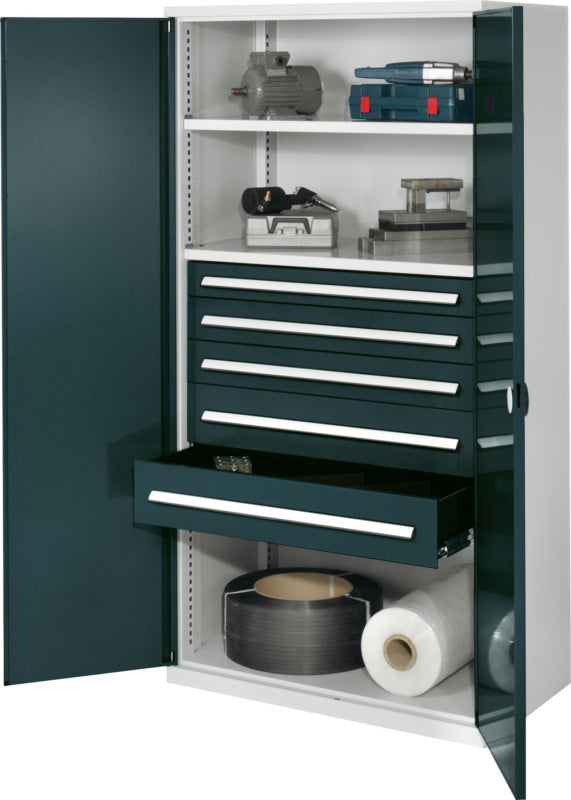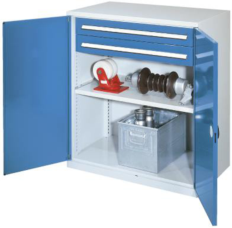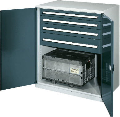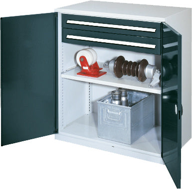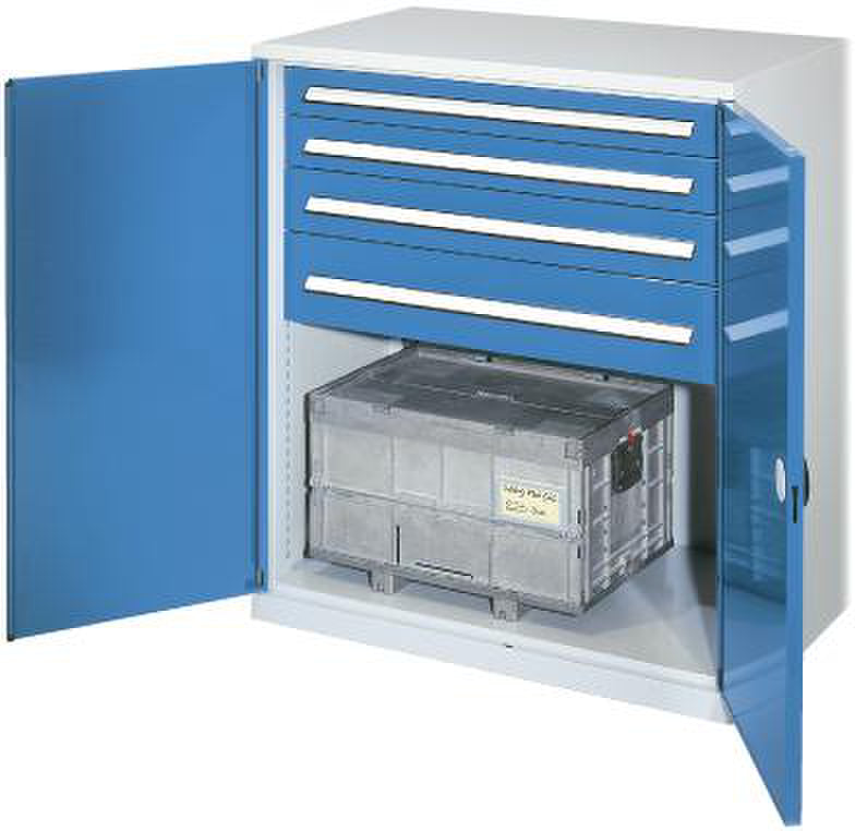 S plnými plechovými dveřmi, se zásuvkami a policemi