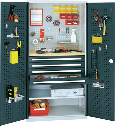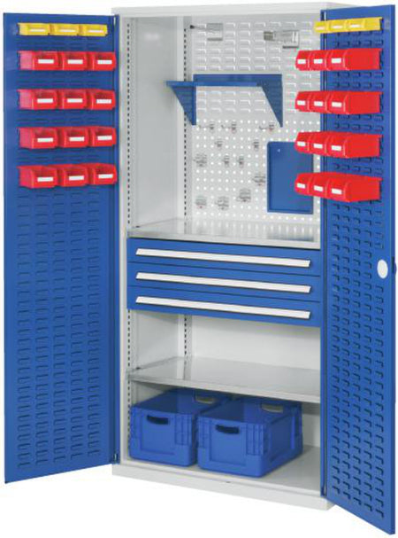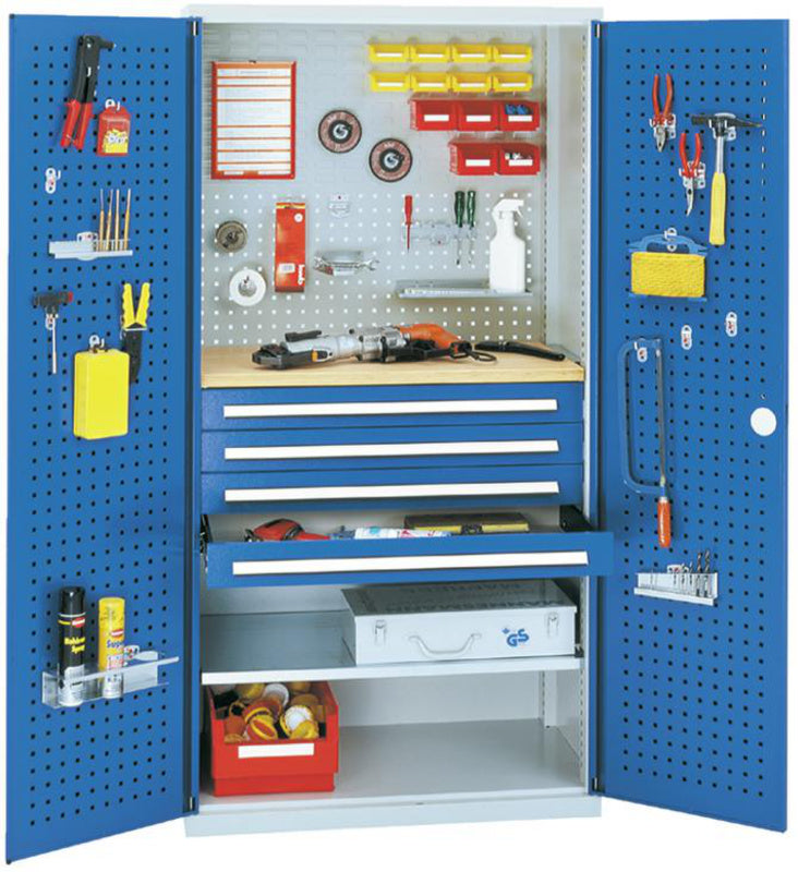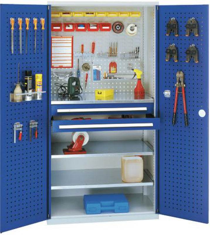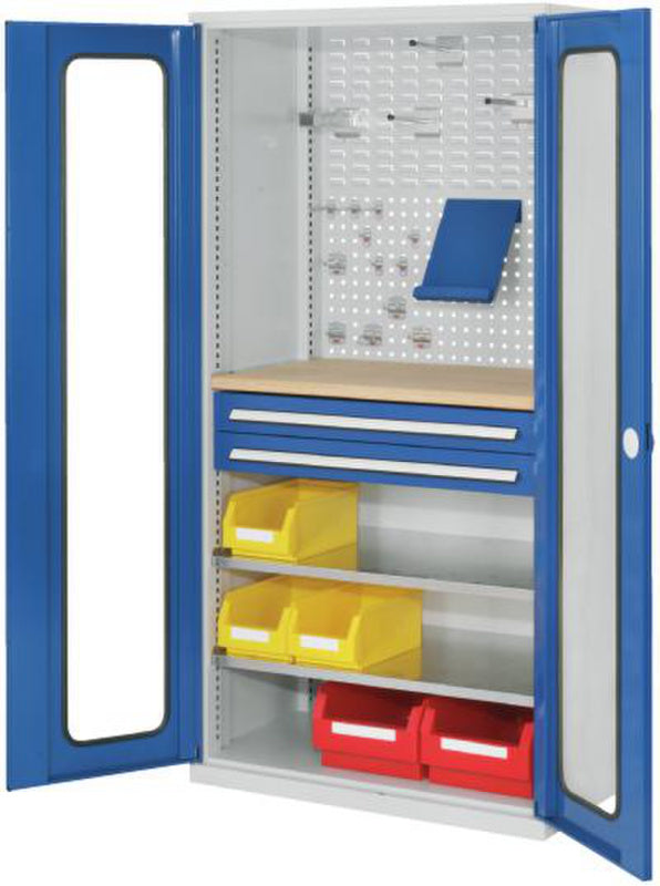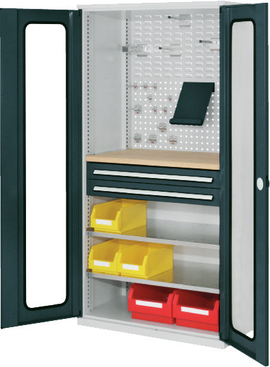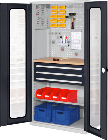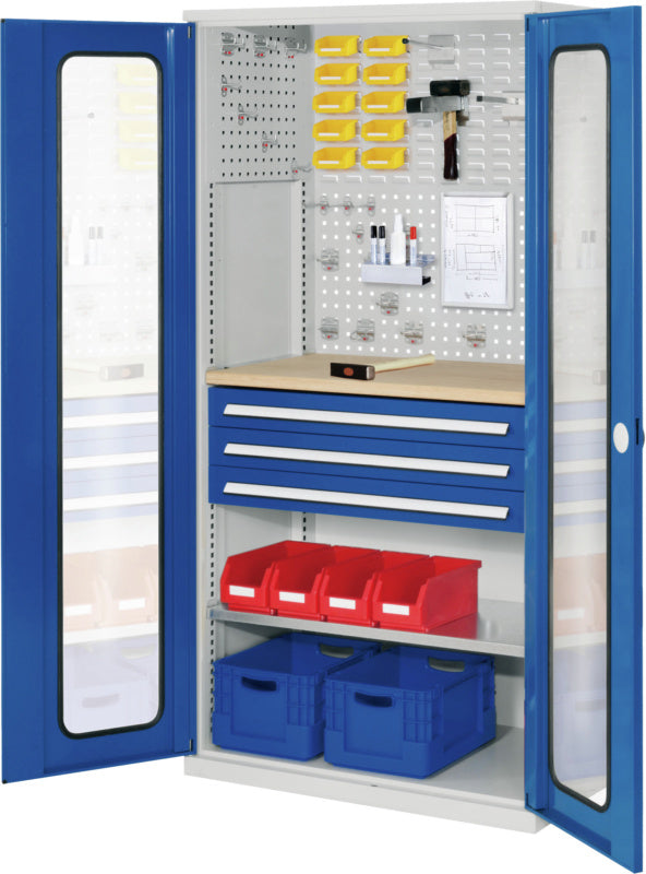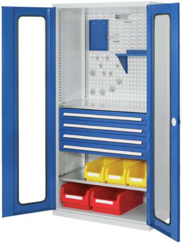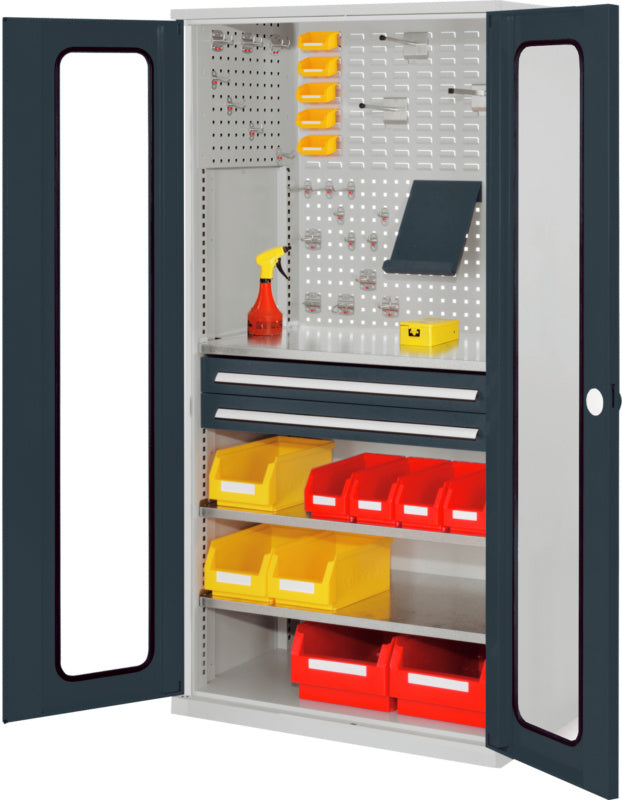 Volitelně s plnými plechovými dveřmi nebo dveřmi s průhledem, se zásuvkami a policemi