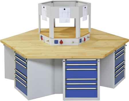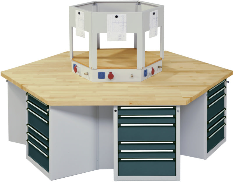 Skupinový dílenský stůl, řada VG, šestihran, s dvojitým zamykáním pro skříně