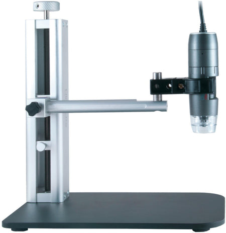 Robustní sloupový stojan s velkým příčným ramenem, rychlé vertikální nastavení a jemné zaostřování. Nastavení výšky 180 mm, horizontální prodlužovací rameno o délce 150 mm včetně 150mm prodloužení, držák na ramenu s možností otáčení o 360°, ostření.