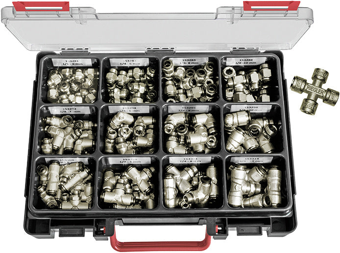 Praktický robustní sortimentní kufřík z vysoce kvalitního plastu s nástrčnými rychlospojkami z naší „univerzální krátké“ řady.