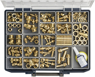 Sortimentní kufřík s nejoblíbenějšími tryskami, objímkami, dvojitými vsuvkami, redukčními vsuvkami, pojistnými šrouby a pojistnými maticemi z naší nabídky soustružených mosazných dílů. Ve 21 plastových krabičkách je přehledně prezentováno celkem 35 různých malých dílů.