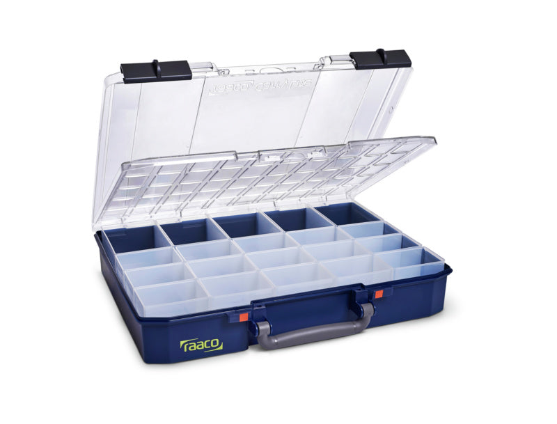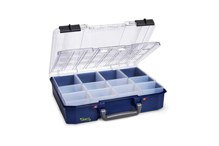 Sortimentový kufr se sendvičovým víkem s U-profily, které zabraňují klouzání obsahu během přepravy. Sendvičové víko s úložným prostorem např. na pět volných listů papíru 80 g/m2. Rukojeť pro přenášení a dva posuvné zámky. Dvě značky na zámcích označují, zda je kufr správně uzavřený.