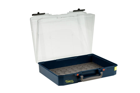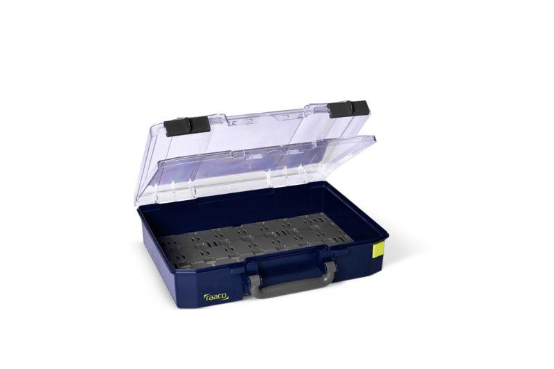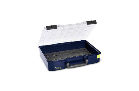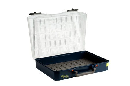 Sortimentový kufr se sendvičovým víkem s U-profily, které zabraňují klouzání obsahu během přepravy. Sendvičové víko s úložným prostorem např. až pro 5 volných listů papíru gramáže 80 g. Nasazovací rošt pro bezpečné zajištění CA vložek. 2 držáky RFID vepředu uvnitř kufru. Těsněné otvory ve víku kufru. Kufr CarryLite LMS má dále posuvné zámky a madlo pro přenášení. Dvě červené značky na zámcích označují, zda je kufr správně uzavřen.