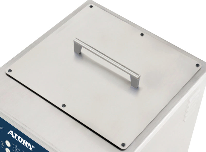 Standardní nerezové zatlačovací víko ATORN pro ultrazvukové čisticí zařízení ATORN ProfessionalCLEAN MF. Vhodné pro ochranu proti stříkající vodě a odhlučnění.