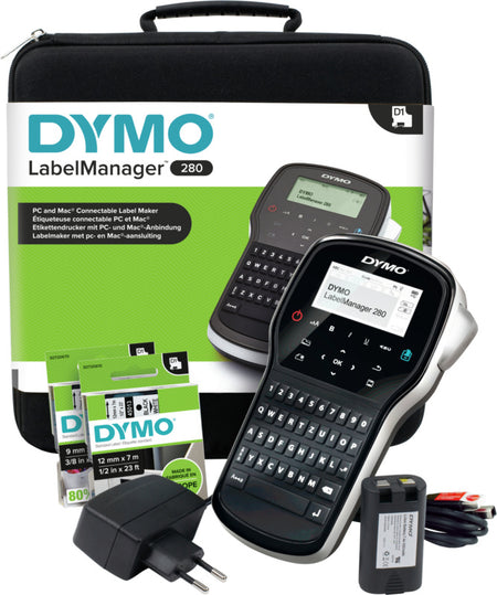 Elektronická tiskárna štítků, 2x černobílá páska D1, 12 mm x 7 m, sada baterií, kabel USB, nabíjecí adaptér, rychlý návod a příručky, záruční list